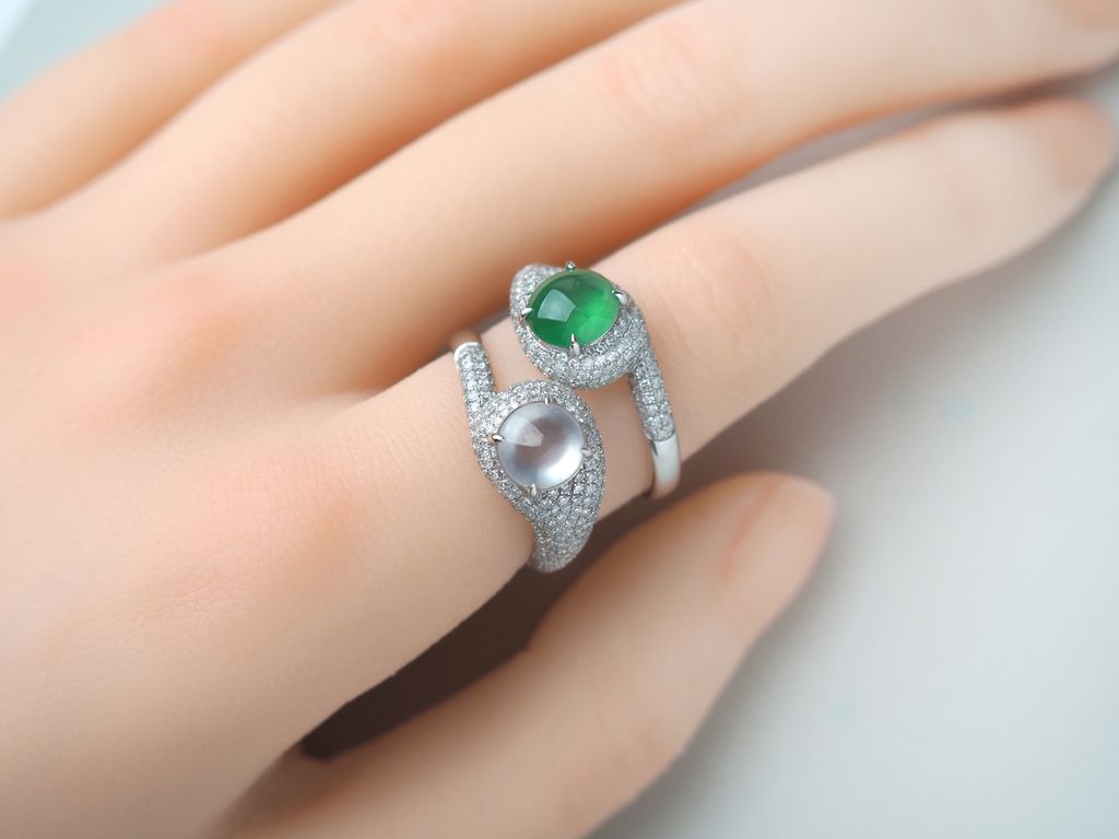 冰玻起瑩,微微尖頂的蛋面,使純潔白翡形成月牙放光