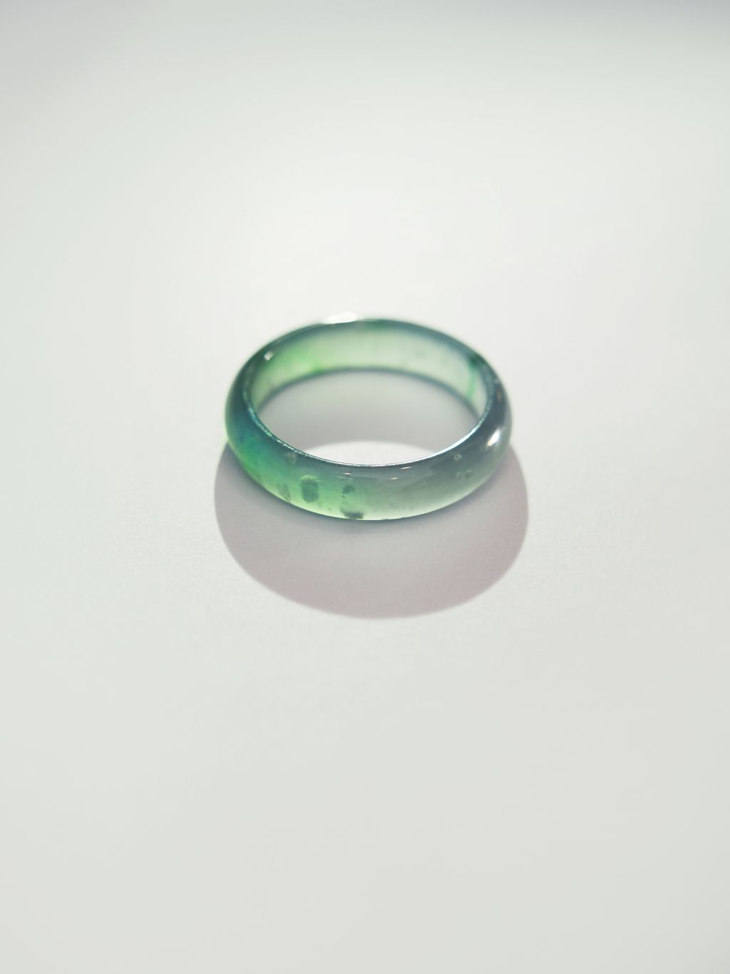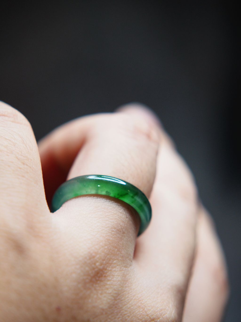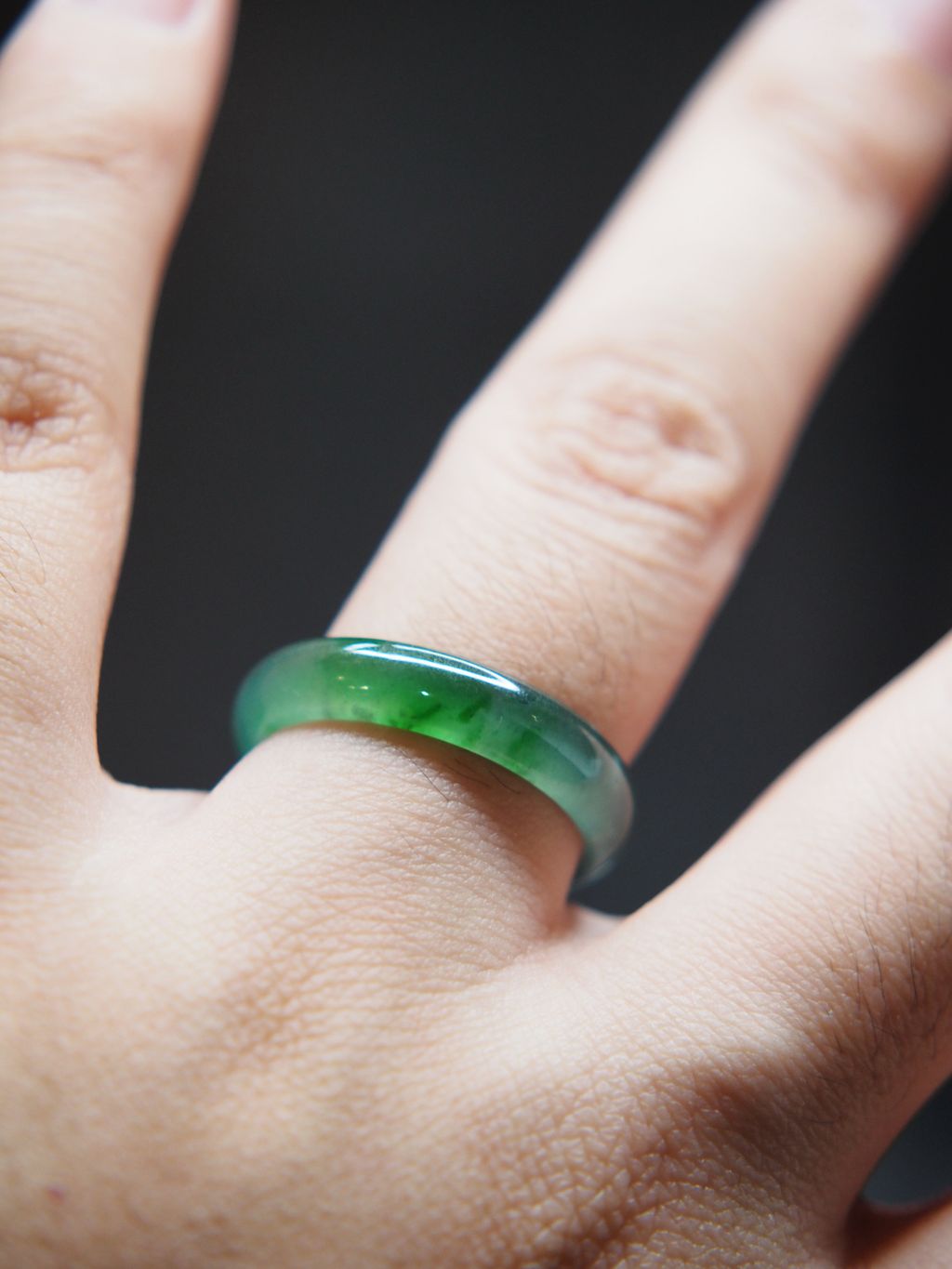 戒指呈明亮翠綠色,色澤濃郁而鮮明,局部透光,質感清麗。